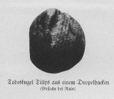 Mit einer solchen Kugel wurde der bayerisch-ligistische Generalleutnant Johann Tserclaes Graf von Tilly am 15. April 1632 während der Schlacht bei Rain am Lech am rechten Oberschenkel kurz oberhalb des Knies verwundet, woran er wenig später, am 30. April, in Ingolstadt starb.