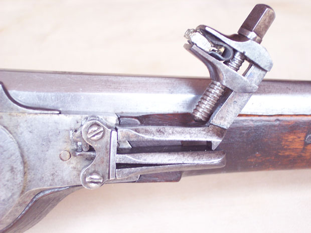 Auf der Laufunterseite auch ein weiteres Zeichen: eine vom Schäfter mit Feilstrichen erzeugte römische Sieben. Diese Art der Markierung wird bisweilen bei Militärwaffen aus größeren Manufakturen angetroffen und hat ihre Bedeutung darin, daß meist größere Mengen von Läufen als Lot an die häufig außerorts tätigen Schäfter geliefert wurden. Dieser zeichnete dann die roh angepassten Schäfte mit den Läufen übereinstimmend zusammen, um späteren Verwechslungen nach der Feinbearbeitung vorzubeugen (s. gleichartige Markierungen Suhler Radschlosspistolen bei Hermann Historica, 39. Auktion, Los Nr. 2245 und 43. Auktion, Los Nr. 1762).