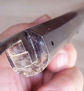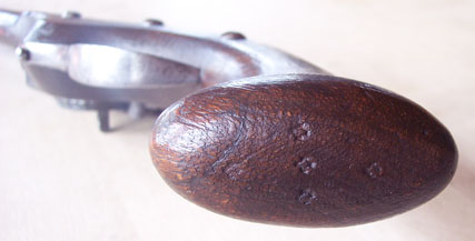 Ansicht des Kolbenbodens. Zu erkennen das Zeichen des Schäfters: vier in Kreuzform eingeschlagene kleine Kreuze. Die Fertigung der Schäfte für militärische Großaufträge (sowohl Musketen-, als auch Pistolenschäfte) erfolgte meist dezentral in kleineren, oft saisonalen Werkstätten, in denen die Schäfter (damals Schafthauer genannt) mit Hilfe der ganzen Familie (und evtl. eines Gesellen) Schäfte für militärische Pistolen und Musketen nach Mustervorlagen in großen Stückzahlen fertigten.