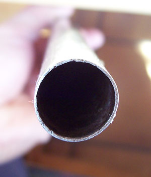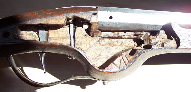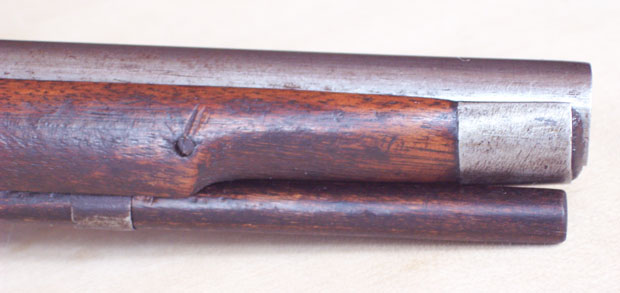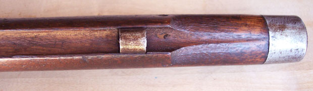 Vorderes Schaftende von unten nach Herausnahme des Ladestockes. Die Holzstärke zwischen Ladestocknut und Laufbett beträgt nur zwischen zwei und drei Milimetern.
