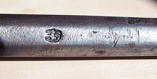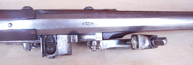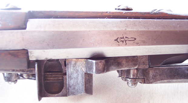 Das nachfolgende Bild zeigt die Laufunterseite mit dem Monogramm des Laufschmiedes. Schön sichtbar hier auch eine weitere, für militärische Massenware typische Eigenschaft im Fertigungsverfahren. Während der Lauf auf der Oberseite im sichbaren Kammerbereich sehr exakt oktagonal gefeilt und poliert ist (s. vorhergehendes Bild), wurde die nicht sichtbare Unterseite nur mit groben Feilstrichen rund bearbeitet. Dieses Verfahren sparte erheblich Material und Arbeitszeit, ohne der Waffe funktionell oder optisch Abbruch zu tun.