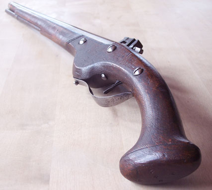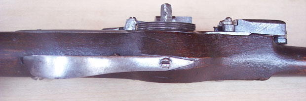 Ansicht der linken Schaftseite. Die Oberfläche weist, trotz ergonomisch sehr gut durchdachter Linienführuing, teilweise nur eine recht grobe Bearbeitung mit Raspel und Feile auf. Auch wenn sich die mit einem Leinölfirnis behandelte Holzart nicht mit Sicherheit bestimmen läßt, ist eine Fertigung aus dem für damalige Pistolenschäfte gebräuchlichen Nußbaumholz wahrscheinlich. Möglich ist allerdings auch eine andere, in Nußbaumton gebeizte Holzart, wie Buche oder Birne. Eine Methode, die für militärische Großaufträge gängig war. Dabei wurde der Schaft aus Rohholz nach der Feinbearbeitung zunächst mit Kalklauge aufgeschlossen, danach mit einem Sud aus Walnußschalen und Erlenholzrinde braun gebeizt und zuletzt mit Leinölfirnis eingelassen. Umlaufend um die Kolbenkappe ist eine feine Nut eigesägt, in welche ursprünglich, als sparsame Schaftverzierung, ein verdrillter Kupferdraht eingeschlagen war. Auf dieser Abbildung ist auch ersichtlich, daß die Schlossplatte von der linken Seite 3-fach verschraubt ist. Eine Befestigungsmethode, welche basierend auf der Charakteristik der Suhler Fertigung, auch in Essen übernommen wurde. Pistolen aus holländischer Fertigung zeigen zwar oft auch eine dreifache Verschraubung der Schlossplatte, können aber zuverlässig durch die von hinten verschraubte Hahnfederstudel unterschieden werden, während bei Nürnberger oder österreichischen (Ferlacher) Modellen fast immer eine 2-fache Verschraubung der Schlossplatte zu finden ist.