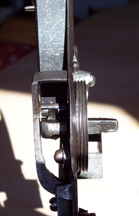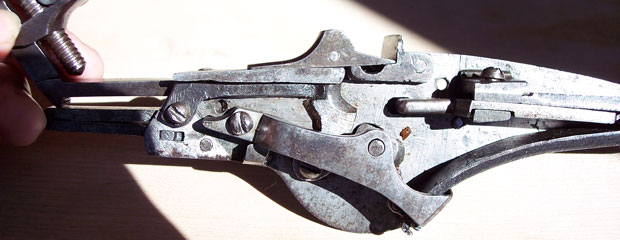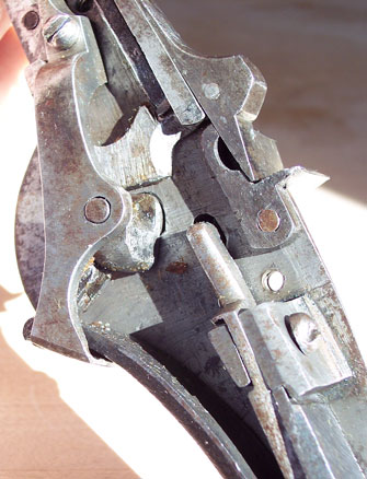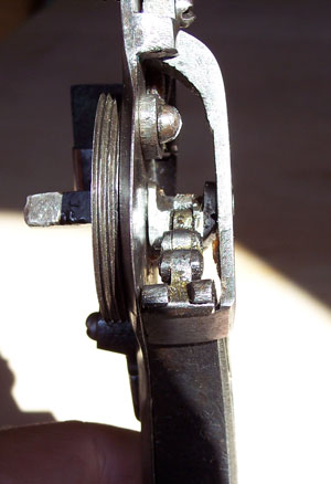 Innenansicht des Schlosses. Die Verarbeitung ist außerordentlich präzise, die Funktion auch heute noch tadellos. Das Schloß zeigt keinerlei Verschleiß- oder Abnutzungserscheinungen, die Federn nach wie vor eine außergewöhnliche Stärke.