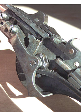 Diese Detailstudie zeigt die Radfeder und die zwischen Radfeder und Radwellenexzenter installierte drei-gliedrige Kette des Schlosses in entspanntem Zustand. Der Pfannenschieber ist noch geschlossen.
