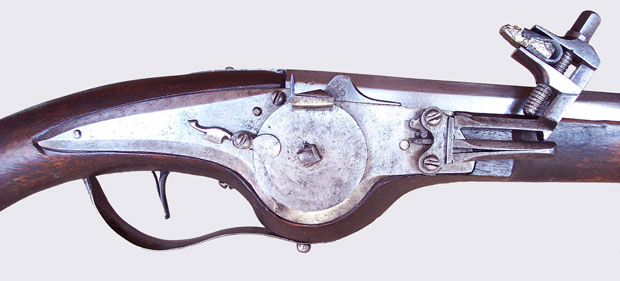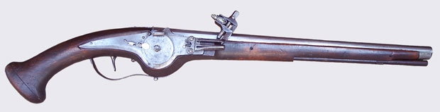 Ansicht des Schloss- und Kammerbereiches der Pistole von oben bei geöffnetem Pfannenschieber. Bemerkenswert ist die genaue Einpassung des Laufes in den Schaft. Auffallend in der Gesamtkonzeption dieser sicher in größeren Stückzahlen gefertigten Militärwaffe ist die Kombination aus scheinbar wenig aufwändigen und damit zeit- und kostensparenden Bearbeitungstechniken (vor allem was die Oberflächen von Schaft und funktionell unerheblichen Teilen anbelangt) und außerodentlicher Präzision in Passung und Oberflächentechnik von Funktionsbereichen. Besonders hier kommt das Können und die Erfahrung der damaligen Handwerker zur Geltung, die manuell und mit vergleichsweise primitiven Werkzeugen schnell, materialsparend und mit erstaunlicher Präzision Arbeiten verrichteten, wie man sie heutzutage, trotz maschineller Unterstützung, (wenn überhaupt) nur näherungsweise und unter großem Zeitaufwand nachvollziehen kann. Ein Umstand, der die meisten modernen Nachbauten so leicht erkennbar macht.