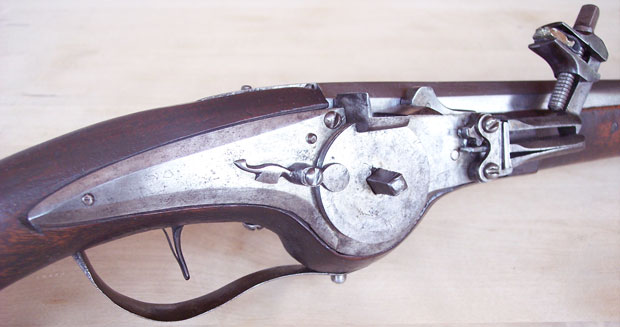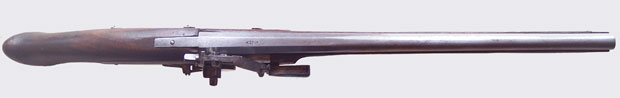 Der gleiche Bereich in der Ansicht von unten. Deutlich zu sehen ist hier der in Längsachse asymmetrische Aufbau der Waffe. Um Platz für das Schloss und den im Schaftinneren bis in den Schlossbereich hineinragenden Ladestock zu schaffen, gleichzeitig um überflüssigen Materialaufbau zu vermeiden, wurden Abzug, Abzugsbügel und Laufbefestigungsschraube auf die linke Schaftseite verlegt.