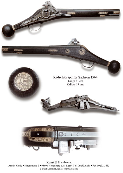 Bei dem oben abgebildeten Nachbau handelt es sich um die frühe Bauform eines kursächsischen Radschlosspuffers, datiert 1564. Der genoppte und geschwärzte Birnholzschaft immitiert Hirschgeweih, mit dem die Schäfte früher, hochwertiger Radschlosswaffen verkleidet wurden. Lauf und Schlossplatte sind gebläut, wie dies bei Originalstücken nur noch selten verhanden ist. Die fehlende Hahnstudel sowie der aus einem Stück gefertigte Abzugsmechanismus im Schlossinneren sind noch sehr frühe Merkmale des Radschlosses, welche bei späteren Modellen sächsischer Puffer nicht mehr erscheinen. Die ungewöhnliche eingezogene Schaftform ist typisch für die Zeit zwischen 1560 und 1570. Die Datierung ist wie im Original unterschiedlich tief eingeschlagen, was auf ein Vordatieren des Rohrschmiedes schliessen lässt. Ein Merkmal, welches bei allen Puffern dieses Typs zu beobachten ist. Wahrscheinlich wurde die "64" erst bei Fertigstellung der Waffe in den Lauf eingeschlagen. Das sächsische Wappen auf der Kolbenkugel steht auf dem Kopf und ist erst beim Führen der Waffe im Sattelholster richtig herum zu erkennen.