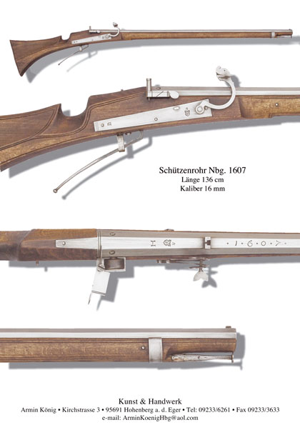 Luntenschloss mit drehbarem Pfannendeckel, jedoch noch mit dem bis zur Jahrhundertwende üblichen Handhebelabzug ausgestattet. Meistermarken von Armin König auf Schloss und Lauf.