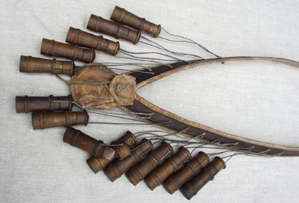 A less luxurious reproduction of a bandolier of styrian origin from the Landeszeughaus Graz. This bandoliers carries 14 powder bottles, which are designed for somewhat stronger charges, compared to the model above. The inner bores of the bottles are conically turned out and hold appr. 16,5 gramms or 250 grains. This reffers to a corresponding musket bore of 18 mm calibre or 15 bullets to the (Nurnberg) pound. Leather lining and bullet pouch are hand sewn and extremely durable..