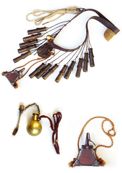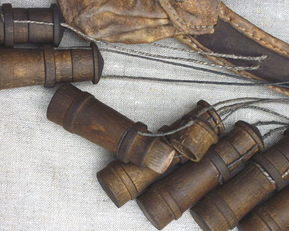 Powder containers of the bandolier. This detail shows the attachment of the bottles by twisted leather strips (a typical characteristics of bandolier from the Emden Zeughaus). In practice, especially in rought field conditions, this method of attachment was not very durable. A bavarian muster report by the Regensburg town colonel Alexander von Haslang from the year 1606 therefore states, that for attaching the powder bottles to the bandolier one should not use leather strips, but "good and strong twisted hemp strings, that can stand the rain in the field, because the straplets earliest will get rotten".