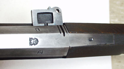 The powder chamber area of the original's barrel with pancover and fence removed. The two lower marks are that of the barrelmaker and the firearm merchant. Obove is the proofmark of Suhl.