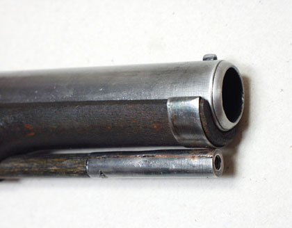 Muzzle detail of the reproduction. The rim of the muzzle is shaped with a rounded edge and a diametrical cannelure, a qualitiy feature seldomly to be seen with military muskets of the early 17th century. This typical Suhl feature testifies for a high manufacturing standard. The ramrod tip in form and finish exactly complies to the original. The copper-soldered metal cap features an inside thread for fixing of a cleaning jag, bullet puller or worm. The sharply edged front end prevents the ramrod to bypass the wad, when ramming it down the barrel.