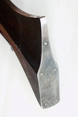 This detail (reproduction) shows the buttplate of the musket. To increase the speed of reloading, many musketeers avoided the time consuming wadding of the musket ball by using the ramrod. Instead the musketieer, after having filled the powder charge into the muzzle, dropped a bullet out of his mouth into the barrel, thus getting the powder more settled. By quickly tipping the butt onto the ground, the charge was additionally compressed and the musketeer was ready to fire. This method was faster as the normal loading procedures, but had some significant disadvantages. As musket balls were shot with a comparable large windage between the inner diameter of the barrel and the diameter of the ball, it frequently happened, that when the musketeers had to shoot downhill, the bullets starting rolling out of the barrel because of the missing wad.