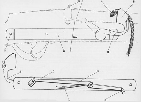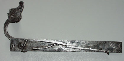 Reproduction lockmechanism. The inner mechanics are rather simple. Good and easy functioning however depends on many parameters: exact reproduction of measurements, angles and distance relations of pivots and levers.