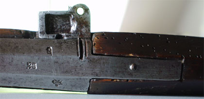 Same detail of the reproduction. The original Suhl proofmarks replaced by master-marks of Armin Koenig. The thread of the barrel screw, exceeding the surface of the breechplug tail by several turns, looks a little bit unprecise. This however is a typical feature with most Suhl matchlock muskets. Manufacturing of threads was a complicated process in the 17th century. As it was almost impossible to avoid lenght tolerences, the screw was designed to be a little bit longer in order to make shure, that all threads of the screw would pass the threaded hole. In addidition the wood of the stock was undergoing a considerable shrinking process throughout the centuries, so by stepwise readjustment of the screw this was passing more and more through the the outer surface.