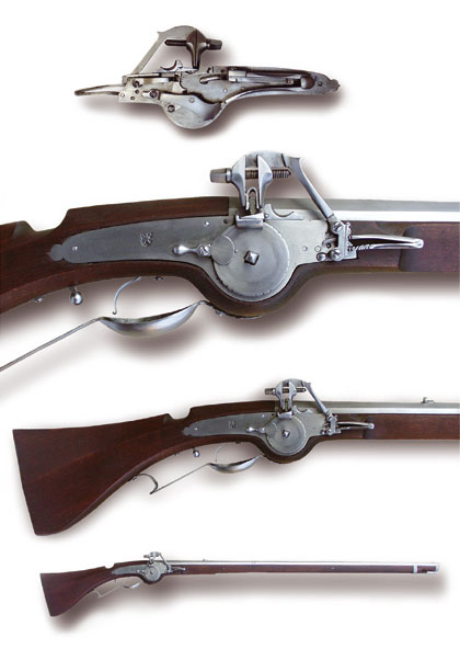 Octagonal barrel with dovetail slided in front and rear sight, transitioning via 6 half-radially cannelures into a round cross section after the first third. Brown stained and oiled beech stock with one ramrod band and nose cap. Wooden ramrod with copper soldered metal top and inside thread for fixing a cleaning jag or worm. Wheellock with trible screwed lock plate. The original manufakturing and proof marks replaced by Armin Koenig's master mark. Safety slide behind the drigger. Spoonshaped drigger guard.
