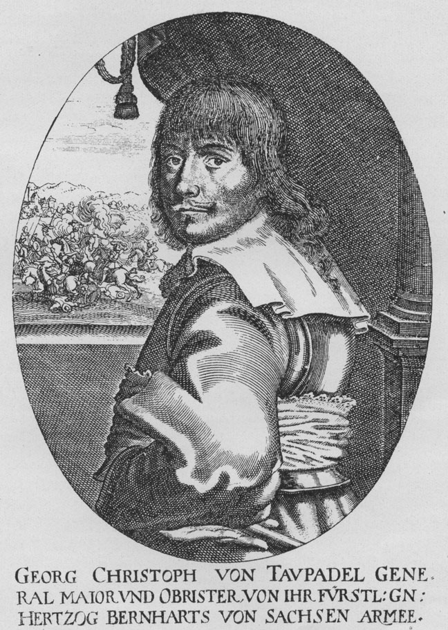Georg Christoph von Taupadel, geb. 17.12.1595 (a.St.) in Börtewitz/Sachsen - gest. 12.03.1647 (n.St.) in Blotzheim b. Basel, 1631 schwedisch-protestantischer Oberst über ein Regiment Dragoner, 1634 schwedisch-weimarischer Generalmajor, 1642 französischer Generalleutnant. Kupferstich, vermutlich von Peter Aubry II (1596-1666), aus M. Merians Theatrum Europaeum Band IV (1643).