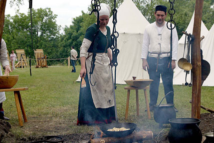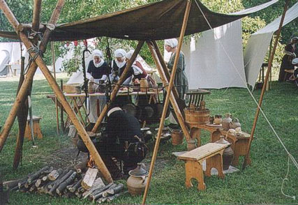 Küchenzelt des Nürnberger Aufgebots. Mit Hingabe widmen sich die Küchenfrauen der Zubereitung des Essens, welche ausschließlich nach zeitgenössischen Vorlagen, Rezepten und Zutaten erfolgt.