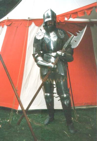 Mitglied des Nürnberger Aufgebots in einem Ganzen Gothischen Harnisch mit italienischer Visier-Schallern und Bart, bewaffnet mit einer Schweizerischen Helmbarte mit Stoßklinge.