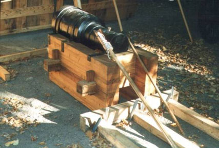 Mauerbrecher, auch Zentnerbüchse genannt - Fluginnenweite an der Mündung: 31 cm. Herstellungsart: geschmiedet in Stab-Ring-Bauweise. Die Büchse wurde neuerdings mit einem leuchtend orange-farbenen Bleimennige Anstrich versehen (s. rechtes Bild)