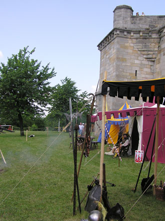 | Die Landsknechtsgruppe Alt-Meusebach hatte vor der Bären-Bastei einige sehr schöne Zelte aufgebaut. Im Vordergrund einige Exponate aus Dieter Schulzes Werkstatt, der nicht nur große Geschütze, sondern auch qualitativ hervorragende und 100% authentische Stangenwaffen, Griffwaffen und Schutzwaffen fertigt. |