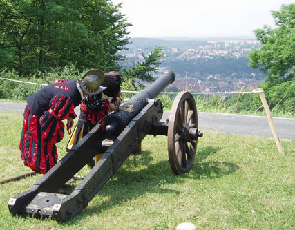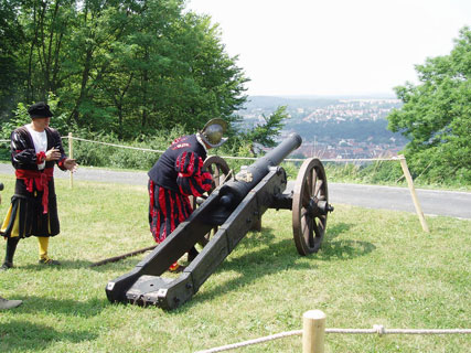 Der Landsknechtsverein "Verlorenes Fähnlein Altmeusebach" (Altmeusebach liegt zwischen Neustadt/Orla und Stadtroda in Thüringen) repräsentierte das 16. Jahrhundert und hatte sich mit einigen schönen Zelten und einem malerischen Lager unterhalb der Bärenbastei niedergelassen. Der Verein stellt eine Landsknechtsgruppe aus der Zeit Kaisers Karl V. dar, also etwa zwischen 1530 und 1550. Die mitgebrachten Geschütze waren allerdings von der Bauart mehr gegen Ende des 16. Jahrhunderts, also etwas jünger einzustufen. Die Kanonen und auch die meisten der mitgebrachten Waffen stammten aus der Werkstatt von Dieter Schulze aus Altmeusebach, unter Insidern der Reenactment Szene als absoluter Könner im Nachbau historischer Waffenrepliken bekannt. Allerdings hätte sich mancher bei den Vorführungen, anstatt einiger Worthülsen im Pseudo-Mittelalterdeutsch, einige detailliertere Erklärungen zu Artillerie, Waffen und Charakteristik der repräsentierten Epoche erwartet. Aber was soll's? - den meisten Besuchern hats gefallen, und nach dem Motto: "ein Bild sagt mehr als 1000 Worte" kamen die Zuschauer in Punkto Optik und Geräuschkulisse dennoch auf ihre Kosten.