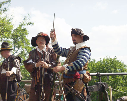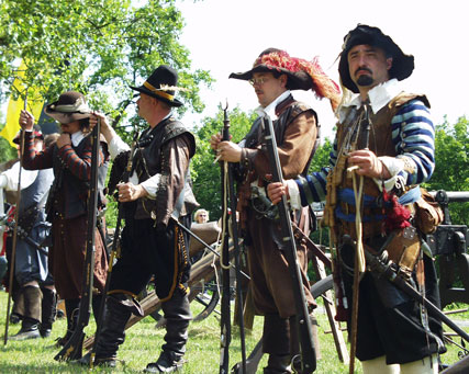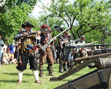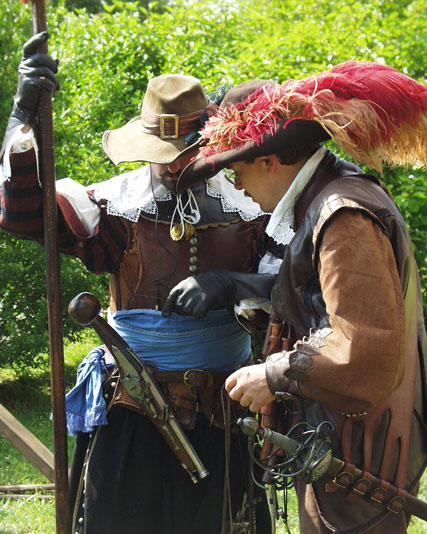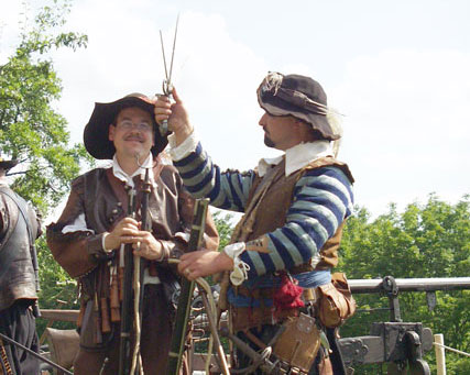 Musketiere Peter E. und Thomas H. bei der Demonstration eines strategischen Ablenkmanneuvers aus dem 30jährigen Krieg: Aus eins...