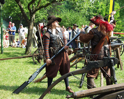 Dies sind nicht etwa Herzog Johann Casimirs Hofzwerge beim nachmittäglichen Vogelschießen im Lustgarten, sondern zwei Musketiere beim Laden...