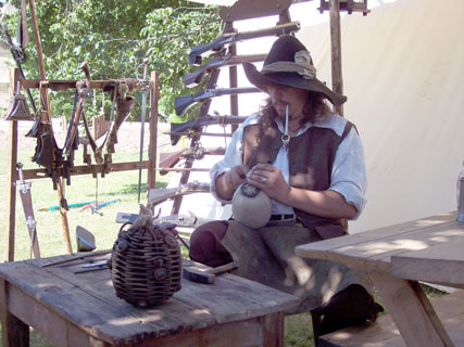 ... hier bei der Herstellung eines hochbrisanten Leuchtballens. Natürlich ließ sich ein Soldat des 17. Jahrhunderts auch bei dieser Tätigkeit sein Pfeifchen nicht so leicht verleiten. |