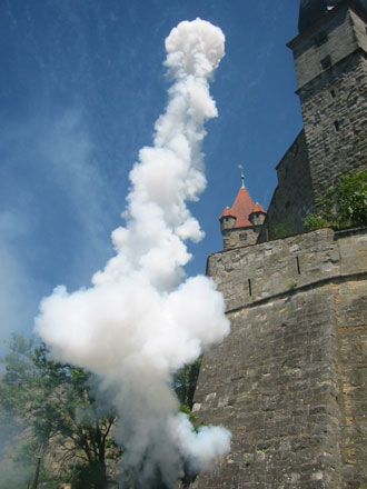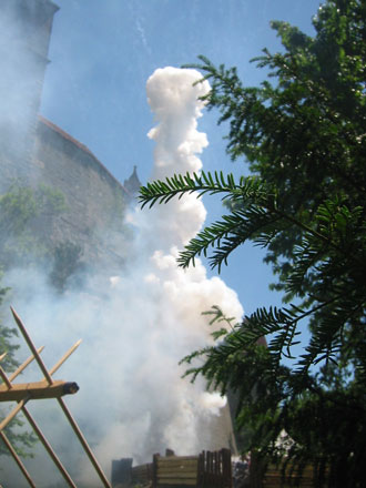 | Unterhalb des blauen Turms, vor der Bärenbastei, hatten die Belagerer Verschanzungen aus Erdwällen, spanischen Reitern, Faschinen und Pallisaden angelegt und dahinter ihre Geschütze in Stellung gebracht. Vor allem der große Mörser bewies eindrucksvoll, mit welcher Gewalt und unter welchem Winkel die Brand und Sprenggranaten der damaligen Zeit in belagerte Festungen und auch befestigte Städte "geworfen" wurden. |