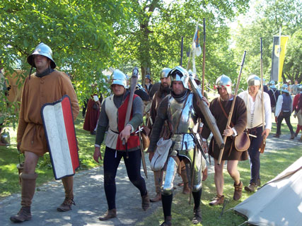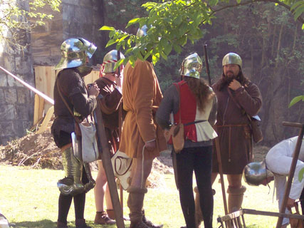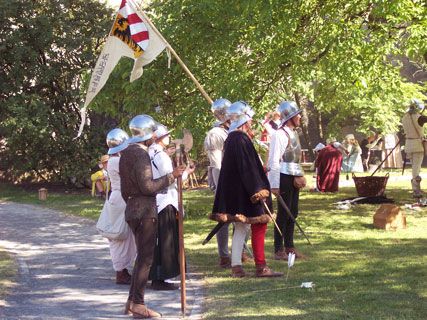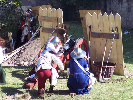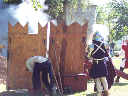 Direkt unterhalb der Bärenbastei hatten die Gruppen aus dem 15. Jahrhundert ihre Zelte aufgeschlagen und ihre Steinbüchsen, Kammergeschütze und anderes Belagerungsgerät in Stellung gebracht. Im hinteren Teil der Bastion hatte man eine Mine unter das Fundament der Veste getrieben, während man im vorderen Bereich versuchte, mit Hilfe einer fahrbaren Belagerungskatze und einer überlangen Sturmleiter an die Mauer zu gelangen und diese zu ersteigen. Dies erwies sich jedoch als hoffnungsloses Unterfangen. Allein das Aufstellen einer mehr als 12 m langen Holzleiter, die nicht nur ihr Eigengewicht, sondern auch das mehrerer Personen aushalten mußte, erwies sich als äußerst schwierig - noch dazu unter Beschuß von oben. Dieses Experiment zeigte jedoch eindrücklich, daß auch im Mittelalter bis in die frühe Neuzeit das Ersteigen einer Mauer dieser Größenordnung so gut wie unmöglich war, ohne daß man zuvor mit Unterminieren oder mit Hilfe schwerer Belagerungsgeschütze eine Bresche erzeugt hätte. Wünschenswert bei diesen mit viel Akribie geplanten und unter großem Einsatz durchgeführten Aktionen wäre eine fachkundige Kommentierung gewesen, um auch den historisch weniger versierten Zuschauern den Ablauf des Geschehens zu erläutern.