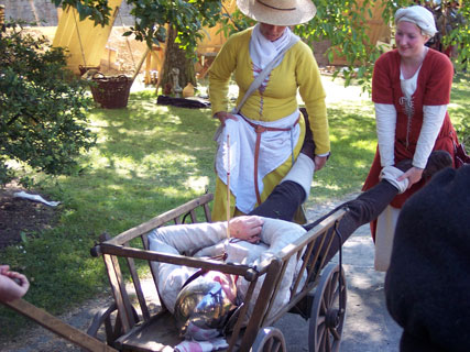 Abtransport des verletzten Burgvogtes. Ob er sich wohl noch auf die ihm bevorstehende Pflege freuen kann?
