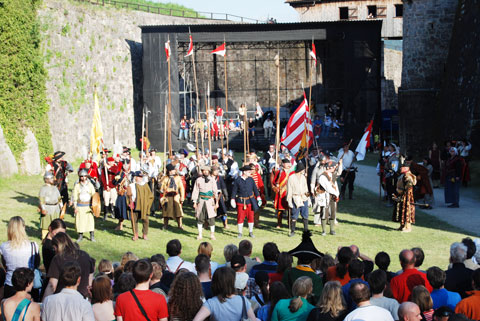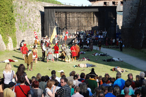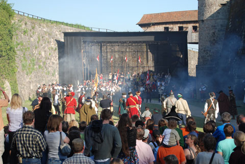 | Die Schlacht beginnt mit Pulverdampf und Kriegsgeschrei. Da die obere Wallmauer gesperrt war, konnten leider nur die vorderen Zuschauer gut sehen. Außer denjenigen, die so schlau waren, sich vor der Vorstellung auf der gegenüberliegenden Hauptbühne zu postieren. |