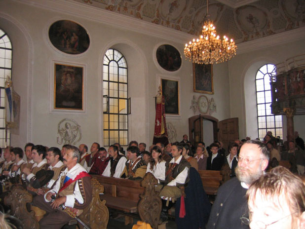 Die Delegationen der historischen Gruppen bei der Fahnenweihe im Kongregationssaal zu Altöttung.