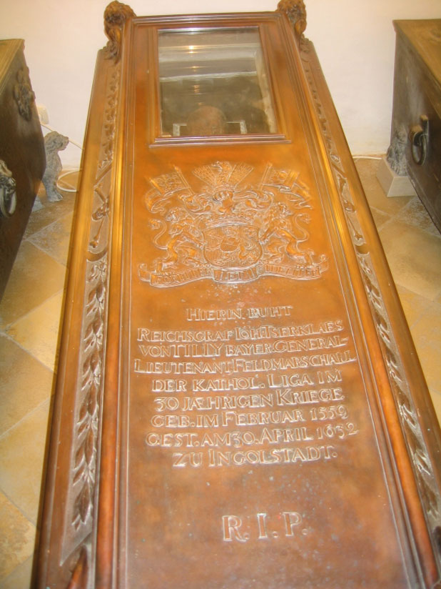 | Die letzten Überreste des Johann Tserklaes Graf von Tilly in der Tillygruft von Altötting. Seine militärischen Leistungen im Dienste Kurfürst Maximilians I. von Bayern sind unbestritten. Über seinen moralischen und sittlichen Anspruch im Umgang mit der der Zivilbevölkerung darf man geteilter Meinung sein. Doch darf man sicher sein, daß der Feldherr mit reinem Gewissen und der Überzeugung aus dem Leben schied, stets zum Wohle und im Einklang mit den Grundsätzen der katholischen Kirche gehandelt zu haben. Am Besten, man schließt sich nach nunmehr 375 Jahren dem frommen Symbolwunsch der Grabinschrift an: R.(equiscat) I.(n) P.(ace)! - Rest In Peace. |
