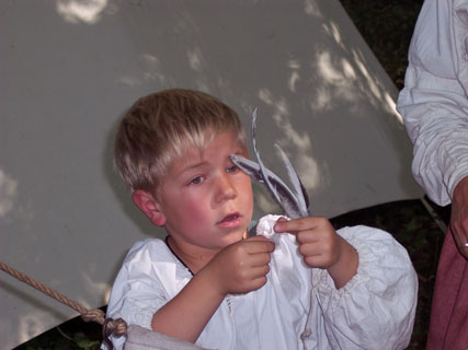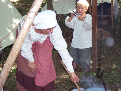 | Elke Grimmer von der "Kaiserlichen Feldwache" kümmert sich um das Essen für die Kinder, auf das Klein-Markus bereits sehnsüchtig wartet. |