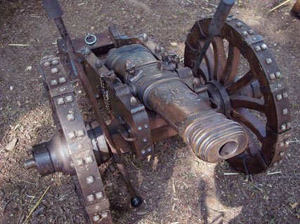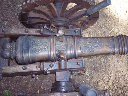 | Ein besonderer Hingucker war dieses Ovalgeschütz nach einem Modell des Nürnberger Zeugmeisters Johann Carl. Das Einzige seiner Art, detailliert nachgebaut von Joachim Enßlin aus Bopfingen. | Blick von oben auf die barocke Ornamentik des Geschützes. Anstatt der üblichen Delphine zieren zwei Soldatenköpfe das Bronzerohr. Ovalgeschütze wurden mit Hackblei (Hagel) geladen. Die ovale Form des Rohres bewirkte eine breitere Streuung der Geschosse. | ||||||||||||||||||||