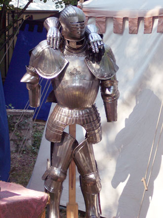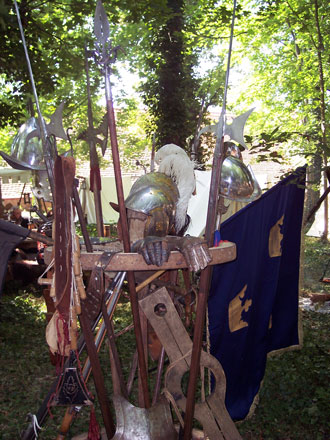 | Ein schönes Stück Kunsthandwerk ist auch die Nachbildung dieses kompletten ritterlichen Harnischs. Allerdings scheint der Träger über einige anatomische Besonderheiten zu verfügen. | Trophäenbündel vor dem Lager des Merchinger Landsknechtshaufens. Zu sehen sind Feuer- und Stangenwaffen, Helme und Fahnen des 17. Jahrhunderts. | ||||||||||||||||||||