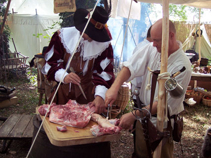 Natürlich wurde in den Landsknechtslagern nicht aus der Konserve gelebt, sondern historisch korrekt mit besten Zutaten gekocht. Hier das fachgerechte Zerlegen eines Schweines. |