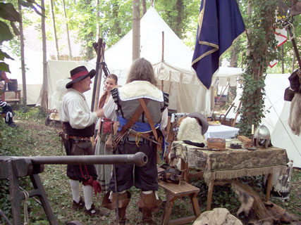 | Das Lager der Merchinger Landsknechte, die zusammen mit der Kaiserlichen Feldwache Tilly aus Augsburg, Des Tillys Wilder Haufen zu Hilspach 1622 und der Gruppe Hortus Bellicus aus Münchberg das 17. Jahrhundert darstellten. |