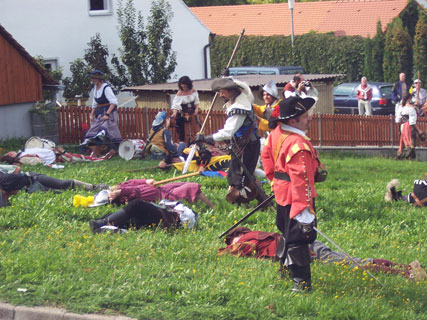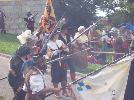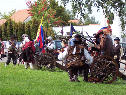 Als Attraktion und farbenfrohes Spektakel für die Besucher fand am Samstag und Sonntag unter donnerndem Geschütz- und Musketenfeuer ein fiktiver Sturm der schwedisch-protestantischen Truppen auf den Wallersteiner Schloßberg statt, welcher von der tapferen Burgbesatzung - im Gegensatz zur historischen Realität - für diesmal tapfer abgewehrt wurde. Die ehemalige Burg befand sich zu Beginn des Dreißigjährigen Krieges im Besitz der katolischen Linie der Grafen von Oettingen-Wallerstein. Sie wurde 1632 annektiert und von Schwedenkönig Gustav Adolf dem in schwedischen Diensten stehenden Generalmajor Lorenz von Hofkirchen übereignet. Nach der für die protestantische Seite verlorenen Schlacht bei Nördlingen am 6. November 1634 mußte Hofkirchen Wallerstein wieder räumen. Die Burg wurde im Jahr 1648 von schwedisch-französischen Truppen endgültig zerstört.