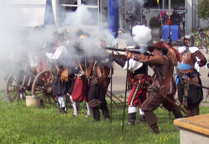 ... und wird von den Schweden mit einer Musketensalve begrüßt.