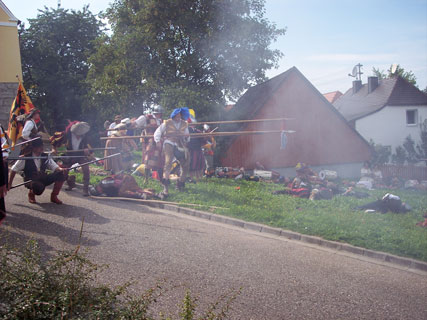 Ausfall der Wallersteiner Burgmannschaft. Gegen deren lange Piken und den Vorteil aus erhöhter Position hatten die schwedischen Belagerer natürlich keine Chance.