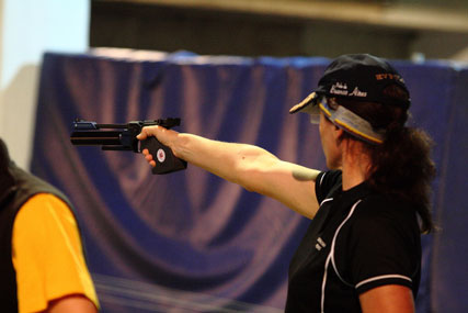 Nach dem Reiten und Schwimmen des ersten Wettkampftages war am Samstagmorgen Schießen angesagt. 20 Schuß mit der Luftpistole waren in einer Zeit von 30 Minuten zu absolvieren. Im Bild Marisa Wartig, Deutschland. |