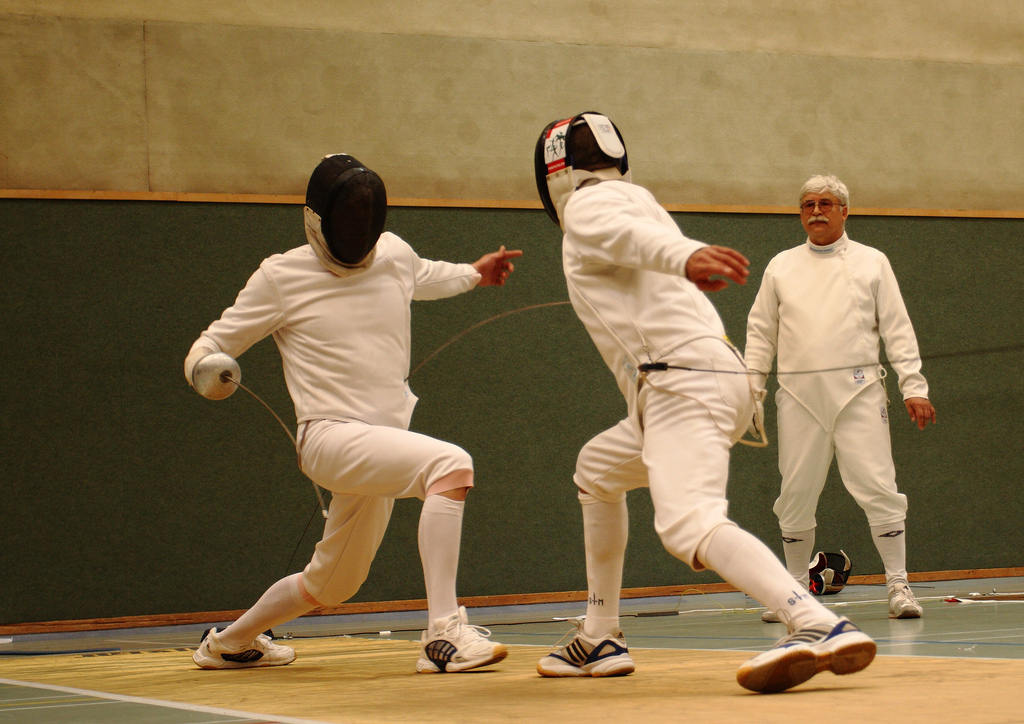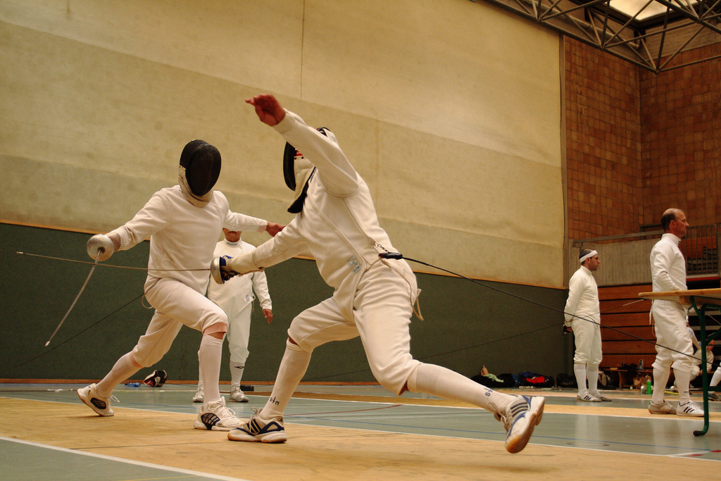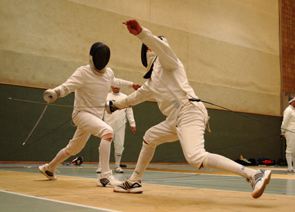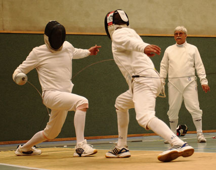 | Die Zeiten, als Fünfkämpfer noch auf Sicherheit und mit gestrecktem Arm fochten, gehören der Vergangenheit an. Heute werden Treffer aktionsreich und in enger Mensur gesetzt. Hier eine schöne Finte mit Umgehung. Die schulmäßige Septim-Parade des Getroffenen geht ins Leere. |
