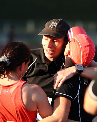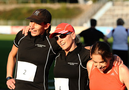 Erleichterung im Ziel und Glückwusch von den Mannschaftskolleginnen . |