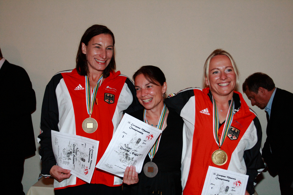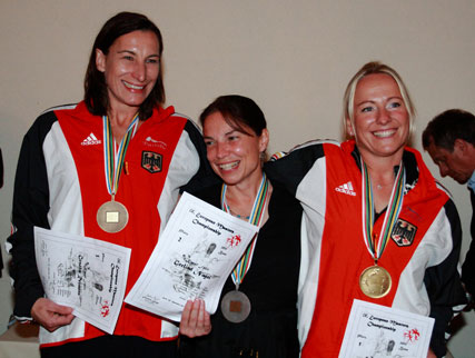 | Die Medaillenvergabe bei den Fünfkampf-Damen F40+ war eine rein deutsche Angelegenheit: (v. li.) Bronze für Gesche Reimers, Silber für Gerlind Nagel und Gold für Beate Schenkel. |