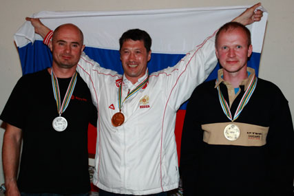 | Die hart umkämfte Klasse der Fünfkampf-Herren M 40+. (v. li.) Silber für Elesey Brykanov (Russland), Gold für Ilshat Khakimov (Russland) und Bronze für Margus Andresson (Estland), der mit der Luftpistole fantastische 185 Ringe schoß. |