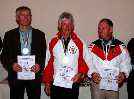 | Die Sieger bei den Herren M 60+ im Fünfkampf (an den vorbildlich gehaltenen Urkunden unschwer zu erkennen). Von links: Silber: Tambet Kibal (Estland), Gold: Bernd Ziganki (Österreich) und Bronze: Dr. Georg Maria Meyer (TC Herne). |