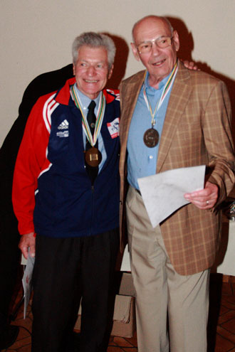| Die Grandseigneurs des Modernen Fünfkampfes starteten in der Altersgruppe M70+. Links: Erwin Stalder (Schweiz) mit der Goldmedaille. Silber ging an Dr. Sandor Köris, der auch das Organisationsteam als Direktor Reiten tatkräftig unterstützte. |